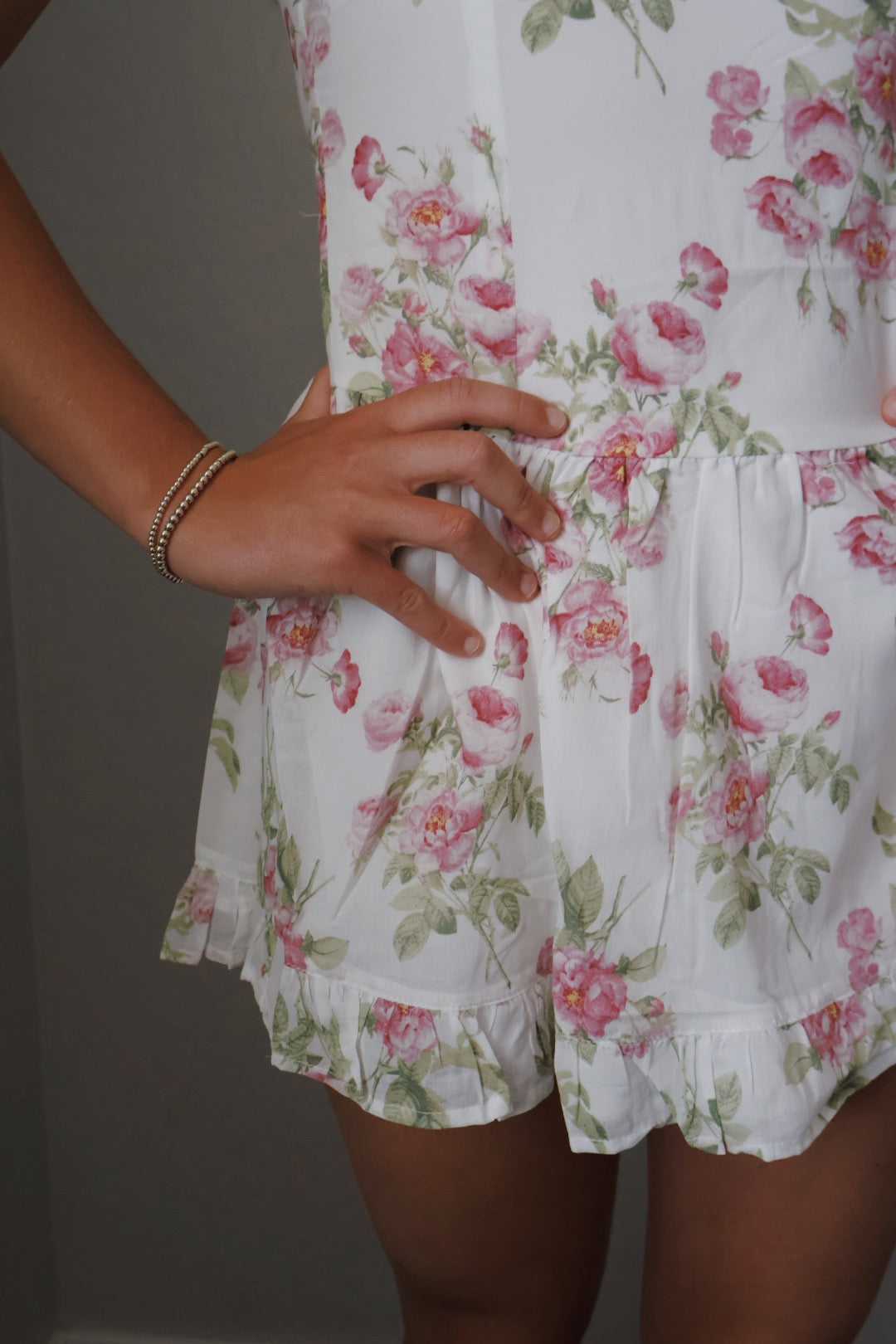 Floral Print Off-Shoulder Wide Band Strap Ruffle Trim Back Zipper Down Mini Dress SELF:100%COTTON LINING